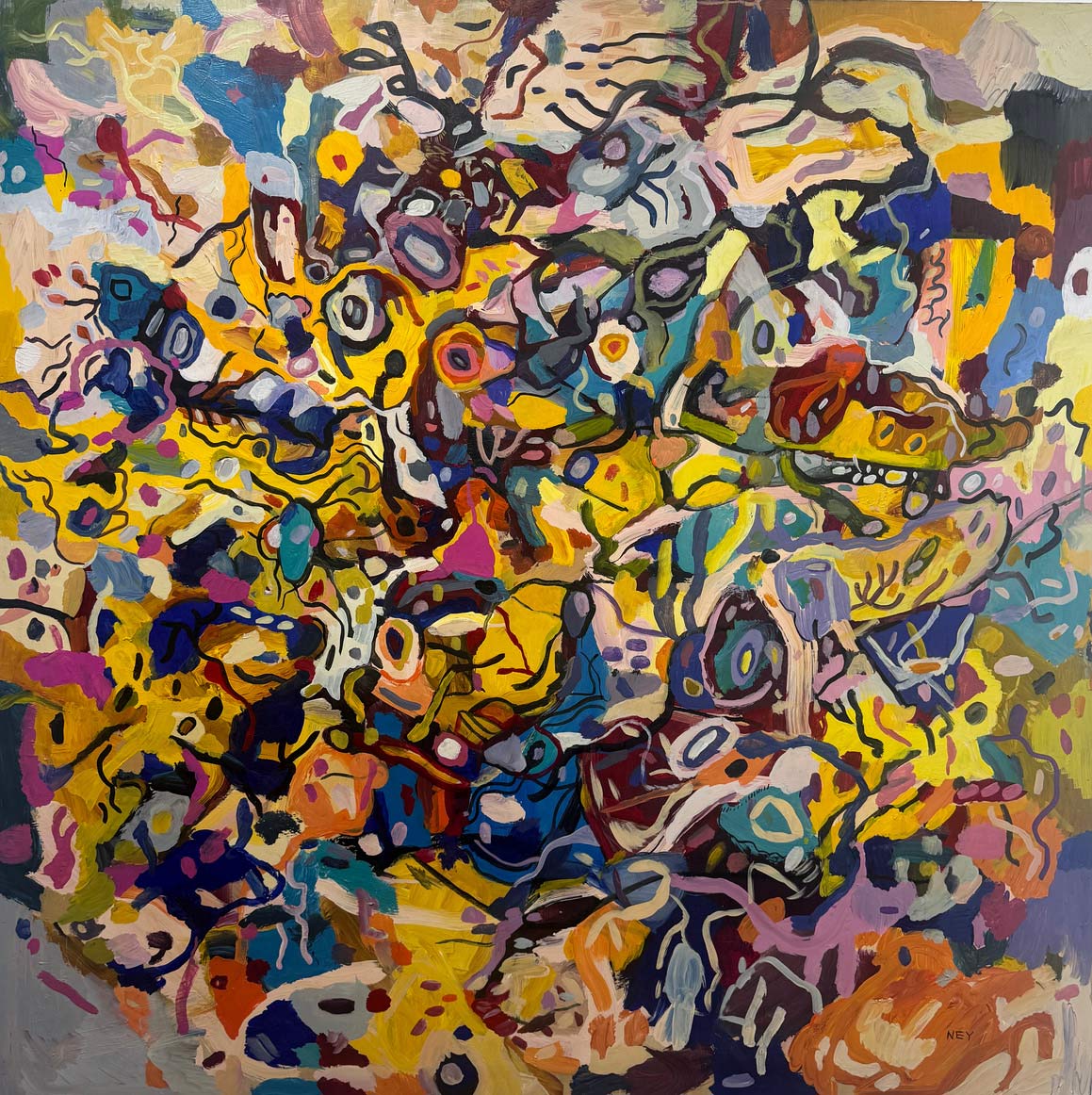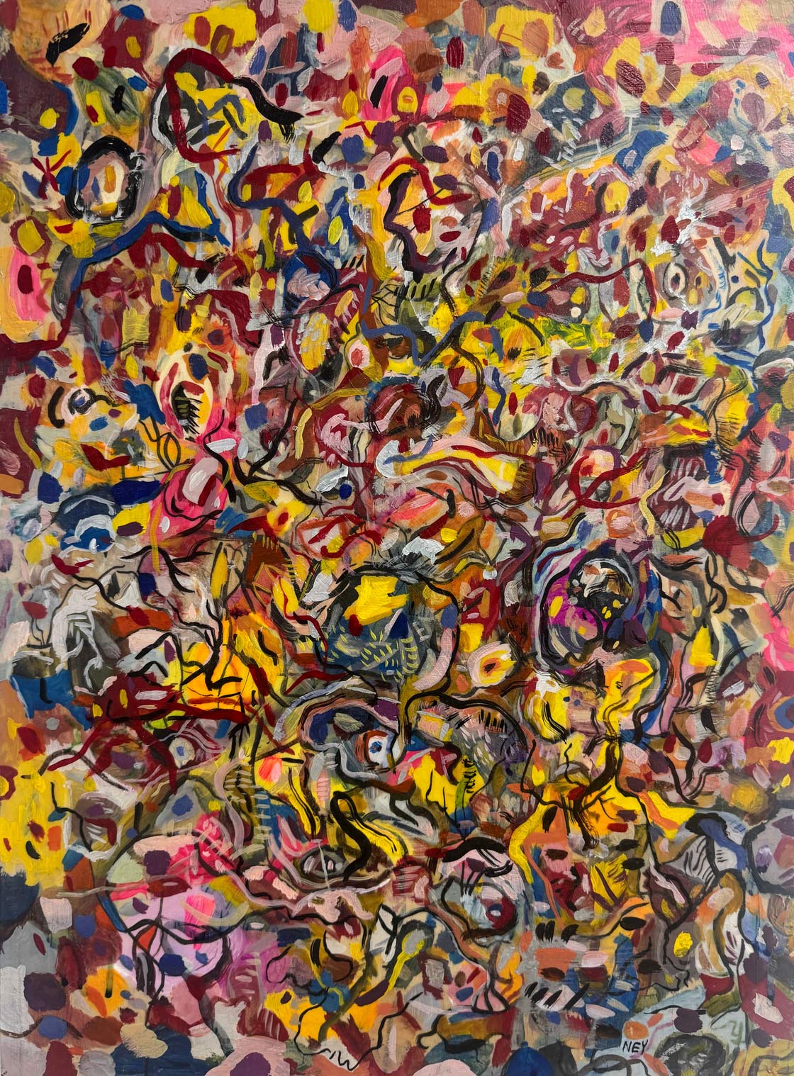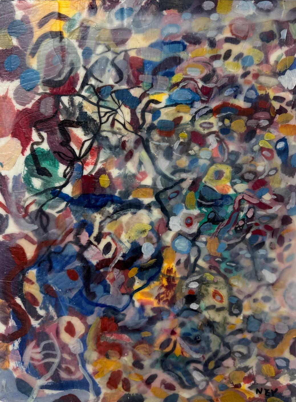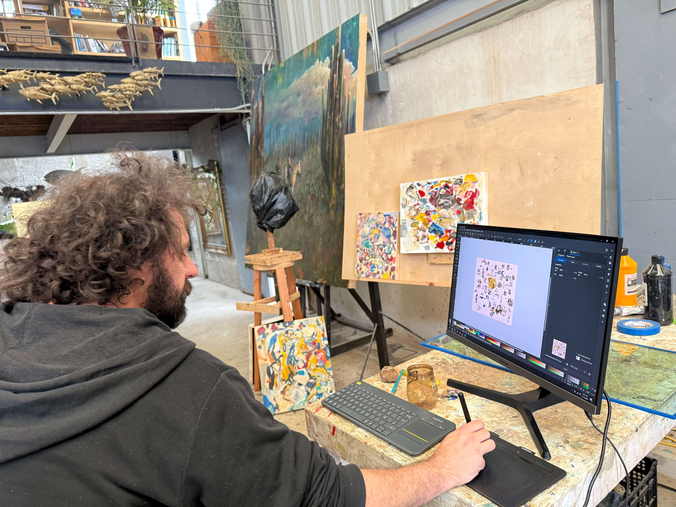 Las piezas se realizan de manera tradicional, con acrílico sobre madera, y luego son registradas, intervenidas y reconfiguradas mediante operaciones digitales. Este tránsito entre medios introduce una lógica de pensamiento lateral: cada imagen existe como una constelación de posibilidades, con versiones, desvíos y estados reversibles.