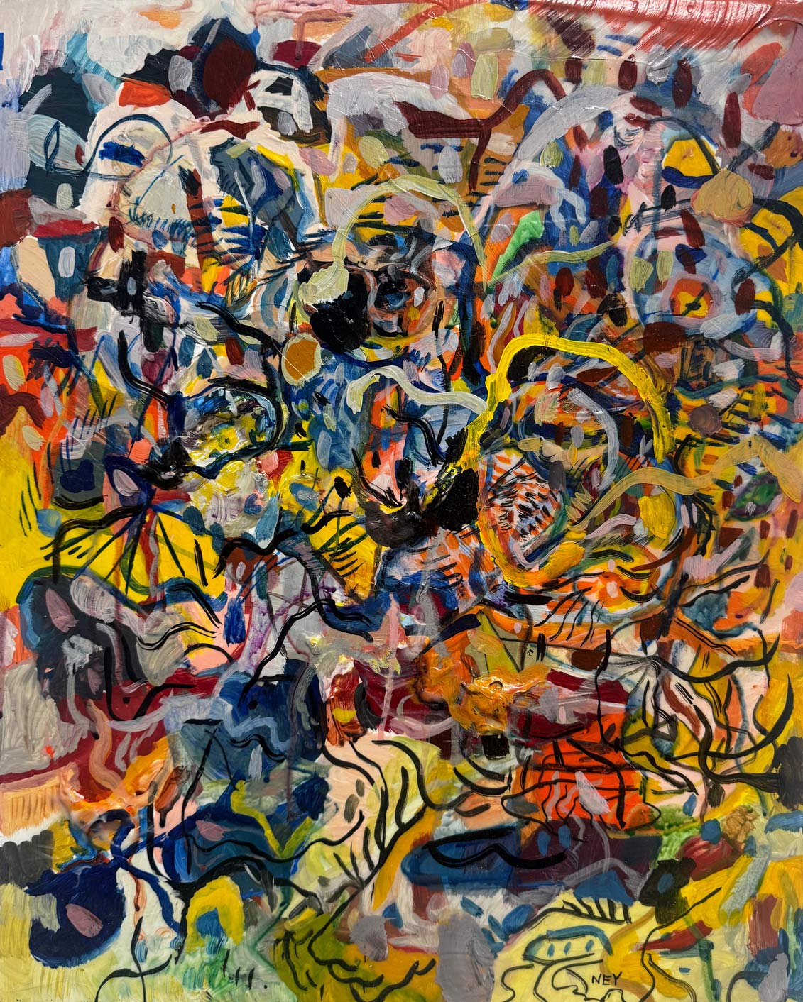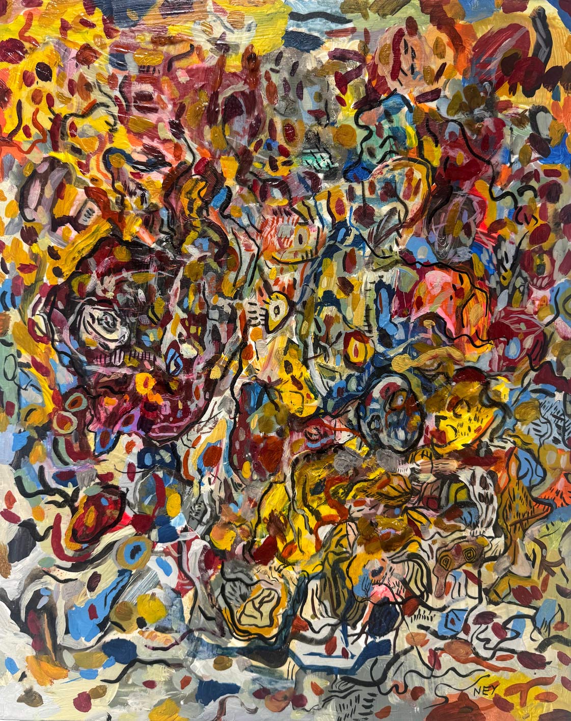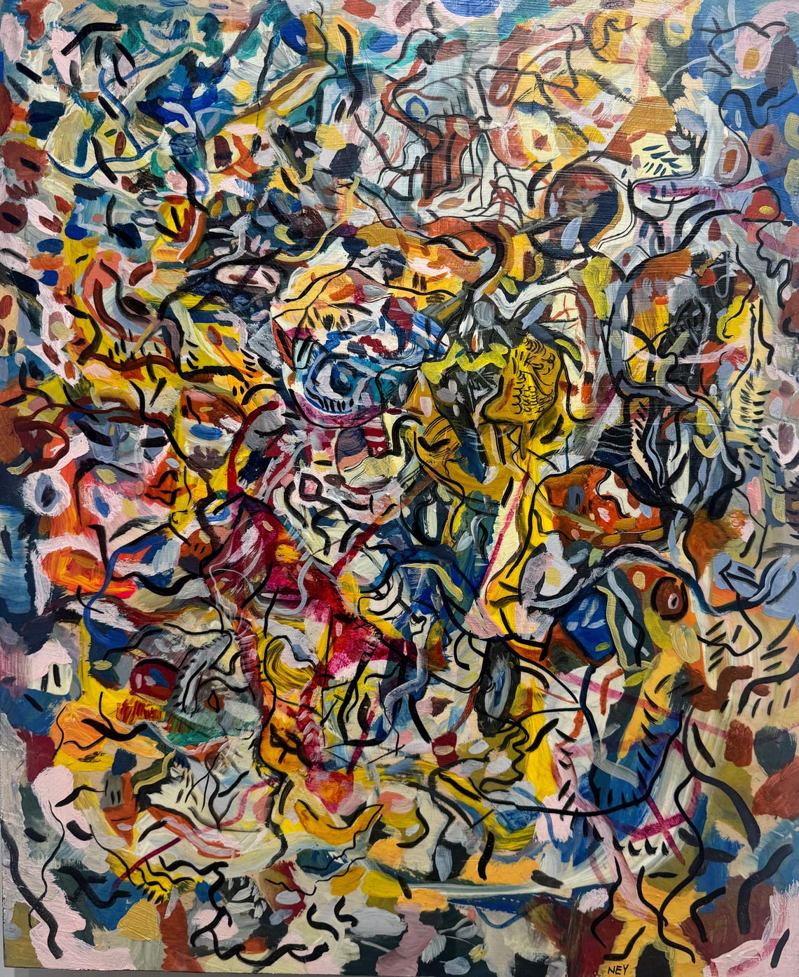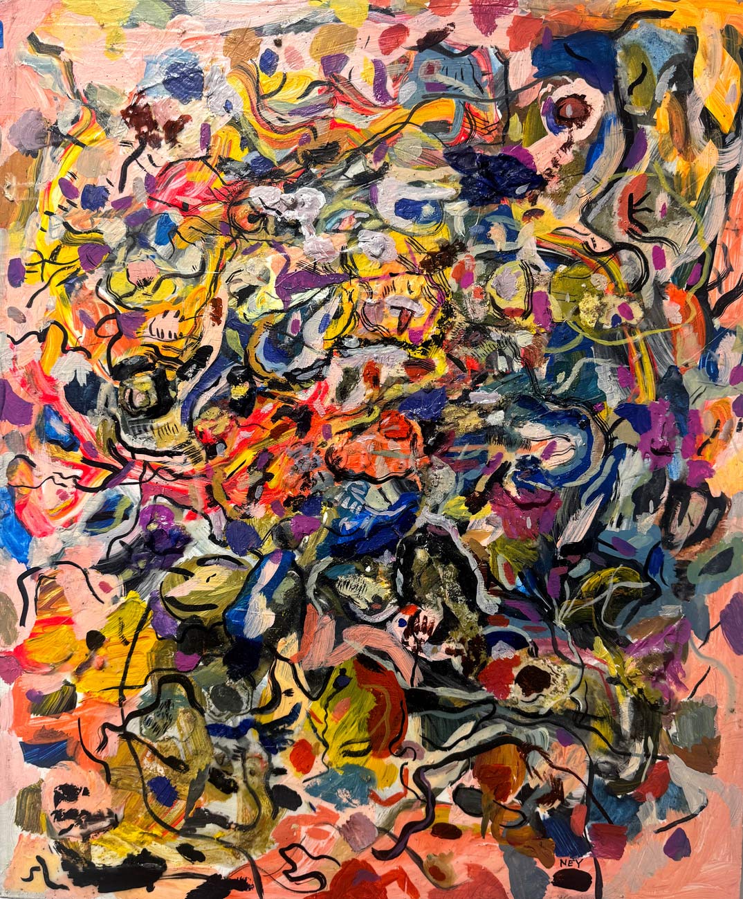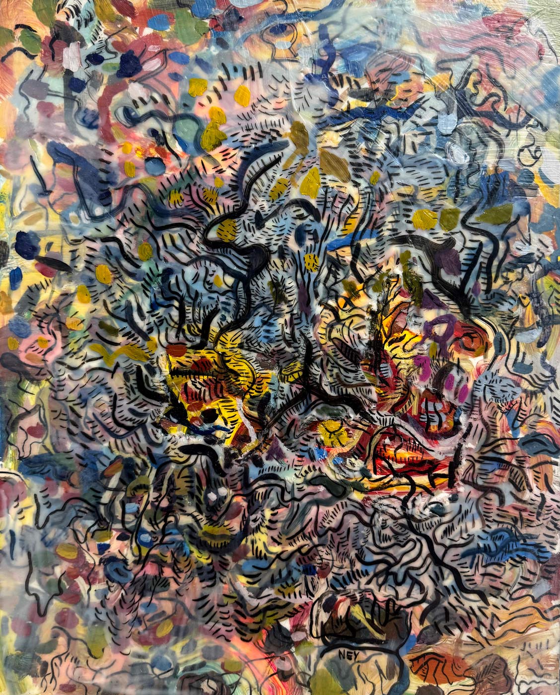 Las obras reunidas en Tiempo lateral surgen de una práctica que articula pintura y procesos digitales. Aunque el trabajo del artista se ha desarrollado principalmente en el ámbito del arte digital y los NFTs, la pintura funciona aquí como origen material, campo de prueba y punto de retorno.